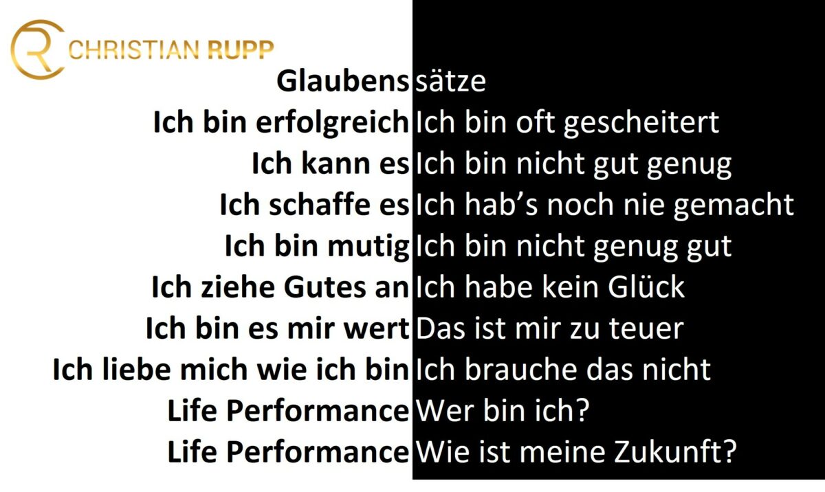 In der Persönlichkeitsentwicklung haben Glaubenssätze ganz allgemein große Kräfte. Sowohl neue, positive, die die Entwicklung mit hoher Geschwindigkeit vorantreiben, als auch leider die alten, zum Teil noch aus der Kindheit übrig gebliebenen, die die Entwicklung gefährden oder verlangsamen.