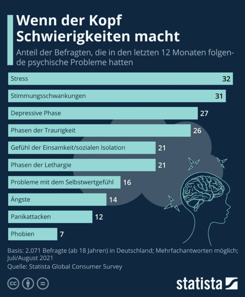 Tatsache ist: Psychische Erkrankungen ziehen sich durch alle Bevölkerungsschichten. Die neue Statistik von Statista (aus: Statista.com, Statistiken zu psychischen Erkrankungen – Wenn der Kopf Schwierigkeiten macht) ist ein Auszug aus “Verstehen, was Konsumenten bewegt” vom Juli/August 2021 und zeigt eine aktuelle Bestandes-Aufnahme der psychologischen “Gesundheit”. Meine Erfahrung zeigt, wer Selbstverantwortung für seine Gedankenwelt übernimmt und […]
